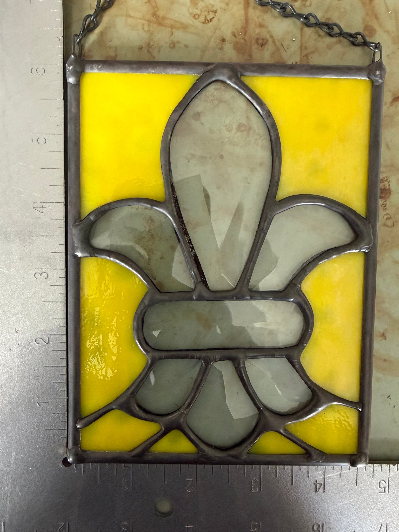 Yellow stained glass with Fleur de lis beveled glass