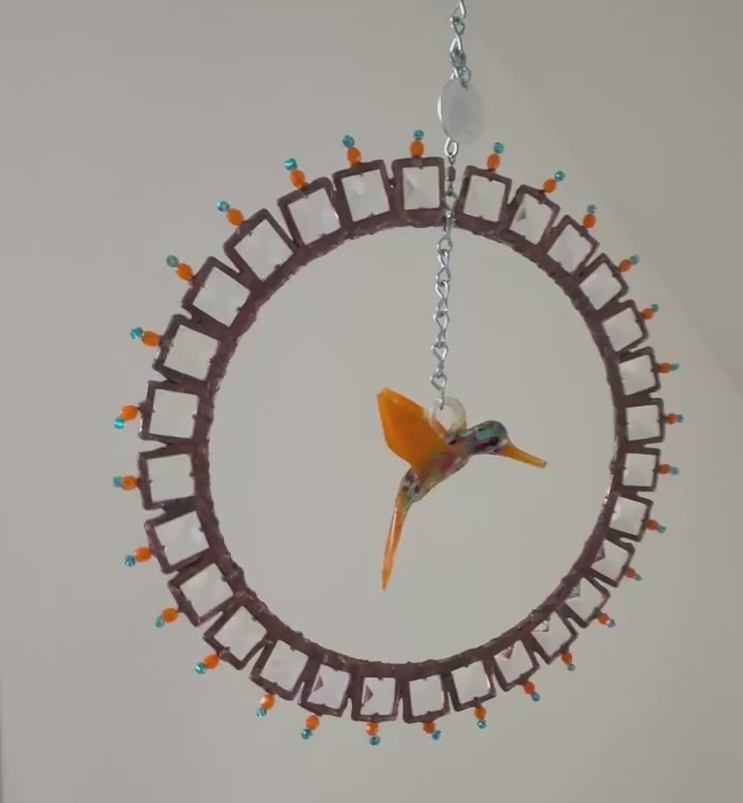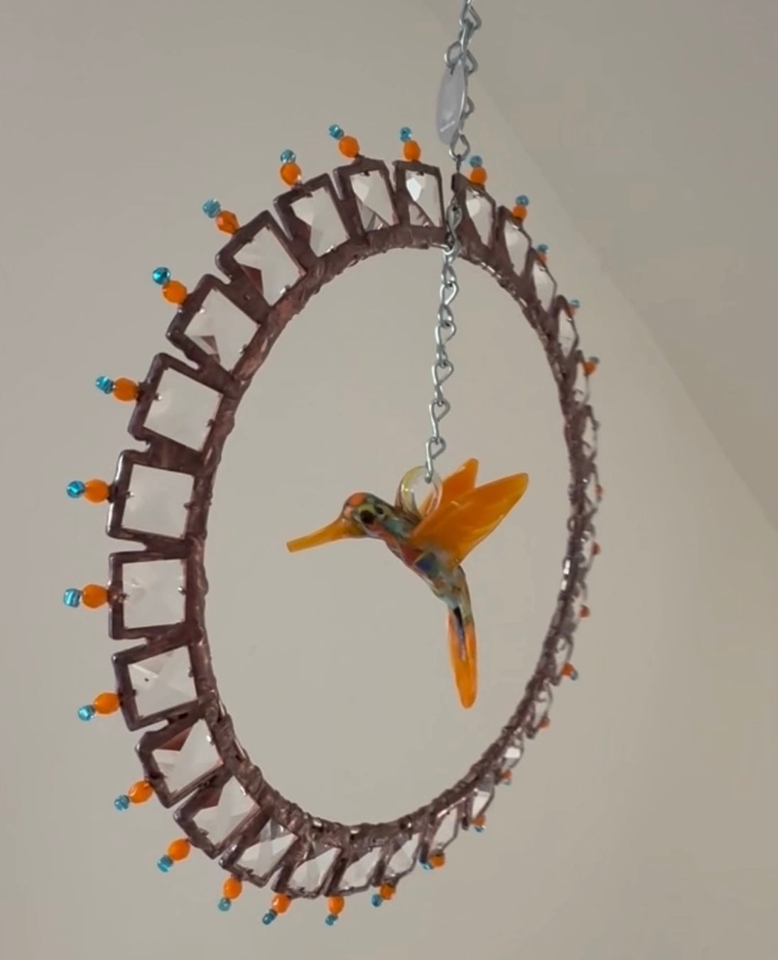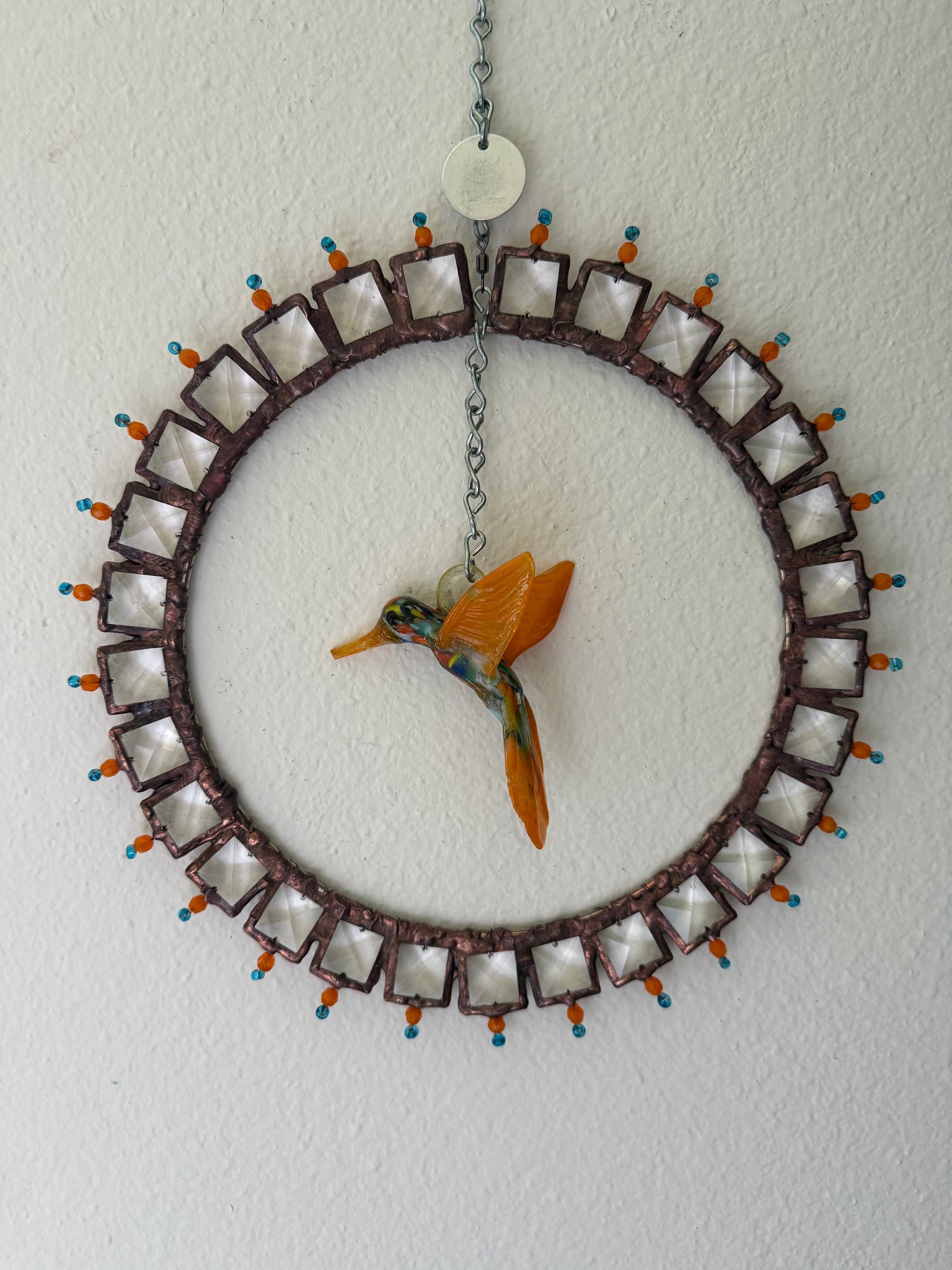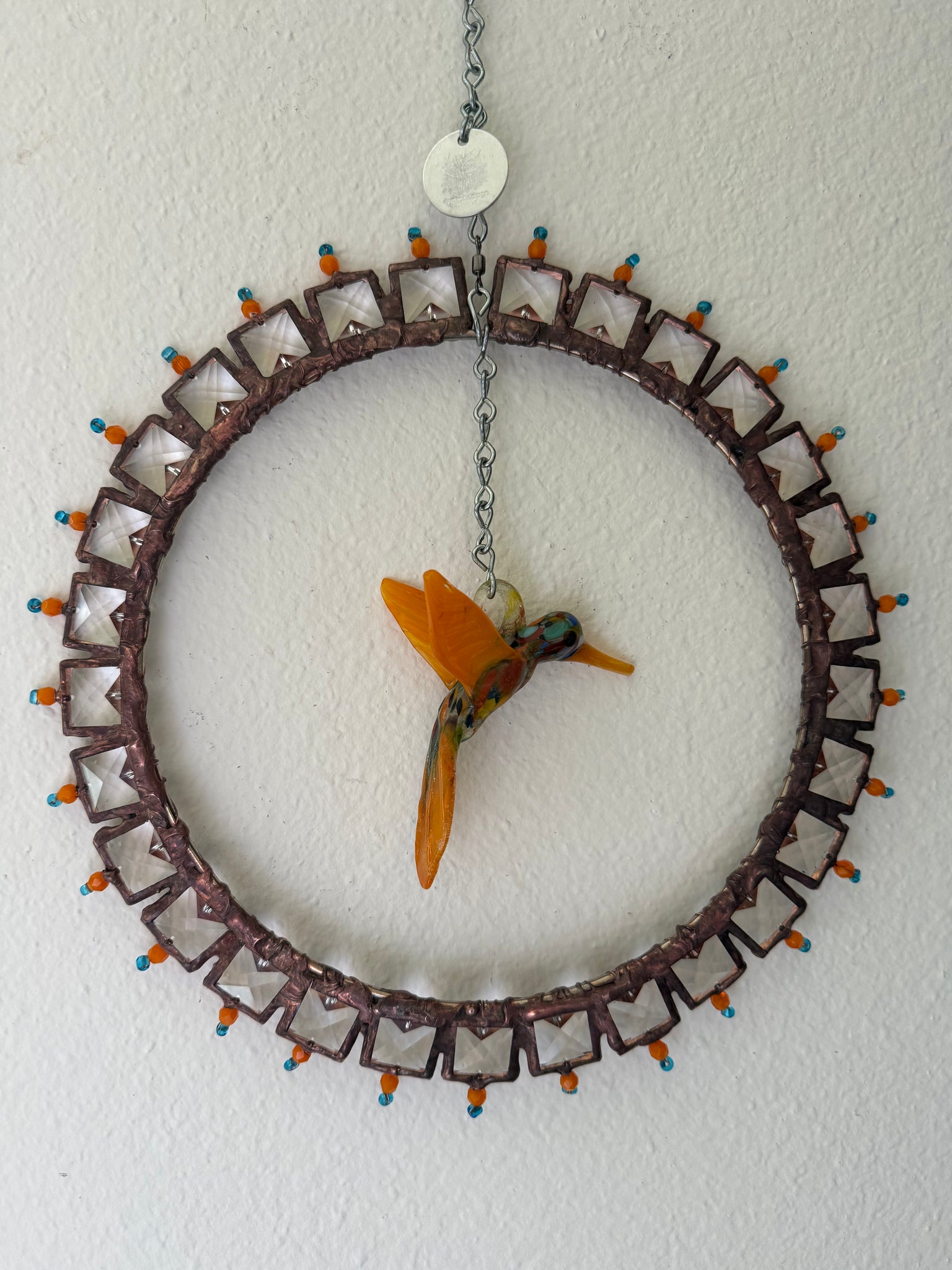 Square crystal bevels with orange and turquoise beads, featuring an orange blown glass humming bird from Puerto Vallarta.