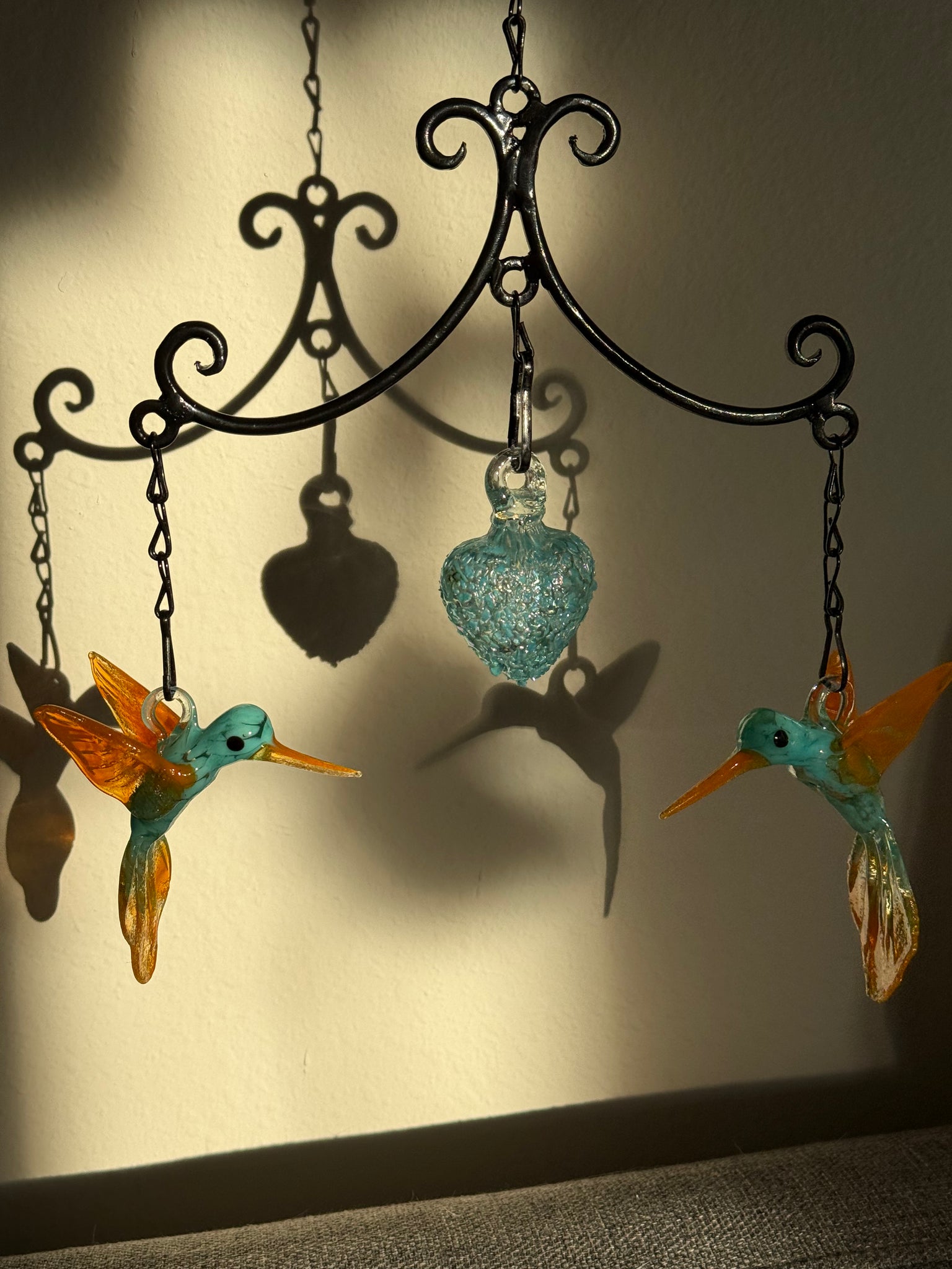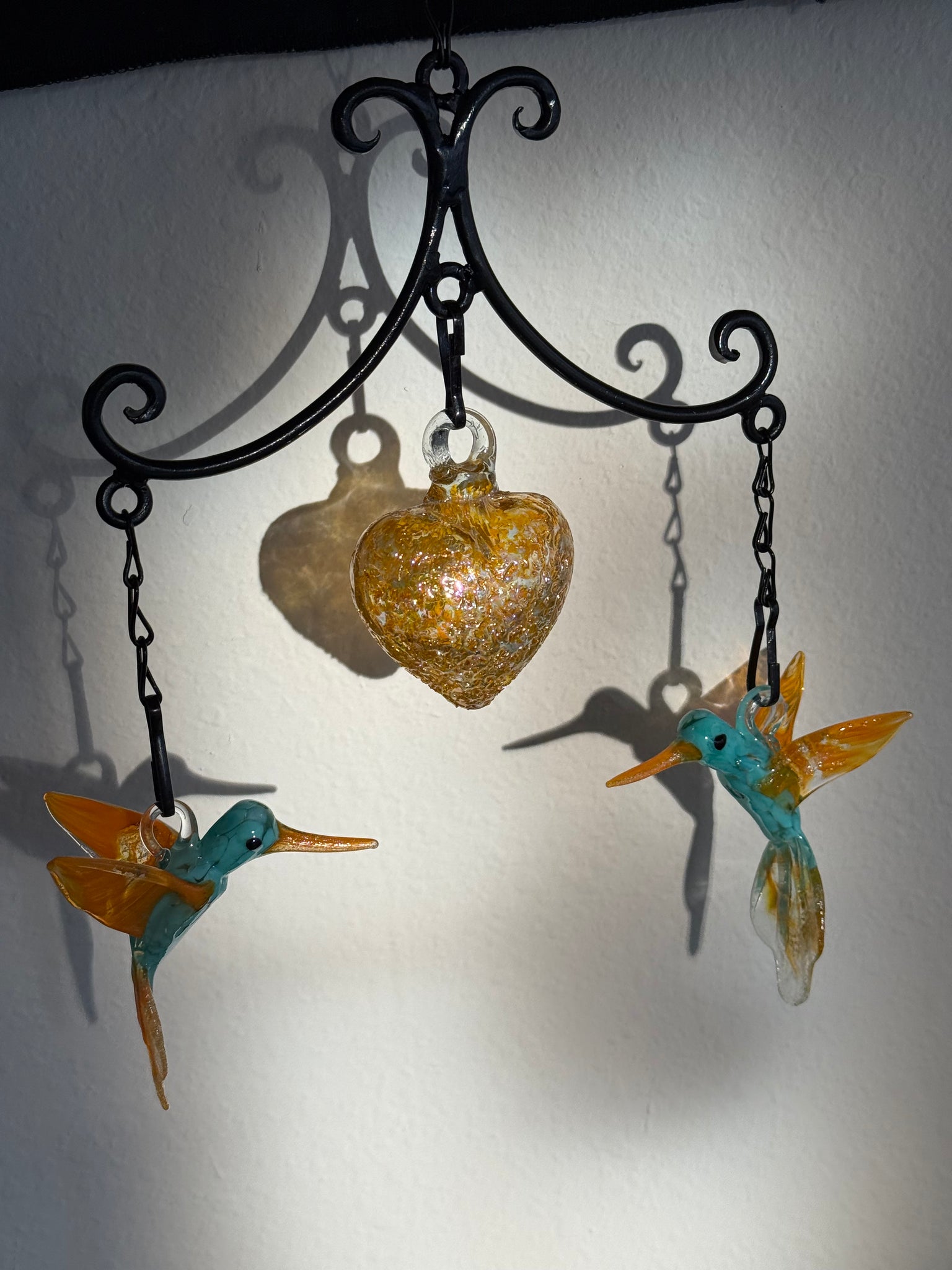 Two orange and turquoise blown glass hummingbirds with either one orange or turquoise blown glass heart.